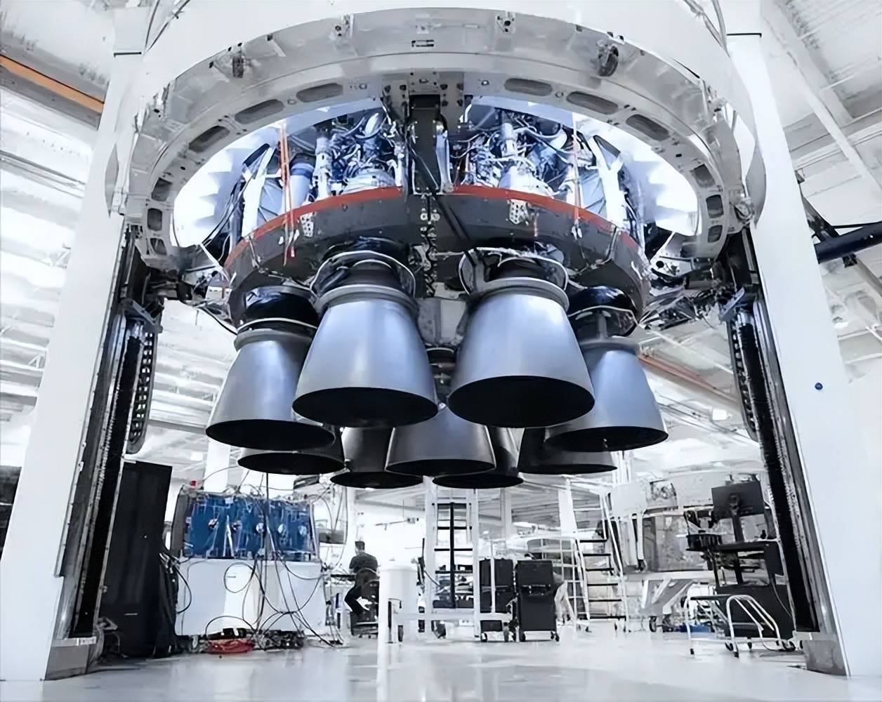 其一级9台天鹊-12A发动机采用“并联冗余设计”,单台推力800kN,总推力达7200kN,既能满足66米火箭的起飞需求,又能通过“按需关闭部分发动机”实现着陆时的低推力控制(变推力范围45%-110%),完美适配垂直回收的“大推力起飞、小推力着陆”需求。