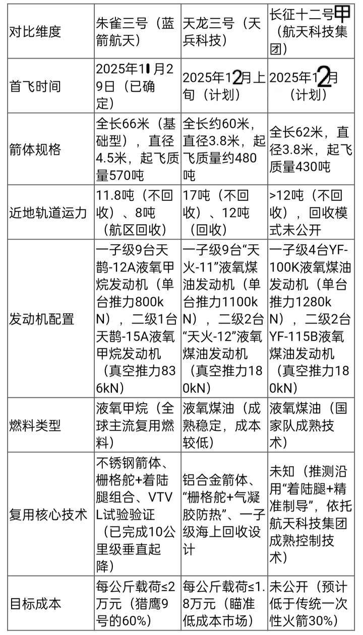 但如果从当前的可操作性与实用性上来说,这个顺序又要从先进性上翻过来了。因为长征十二号的YF系列发动机与航天科技集团的供应链,使其首飞成功率预期最高(预计90%以上),可快速承担国家级卫星发射任务;天龙三号的大运力与低成本,适配低轨卫星组网的“批量发射需求”;朱雀三号的液氧甲烷技术虽先进,但仍需时间验证复用可靠性(首飞回收成功率预期70%)。